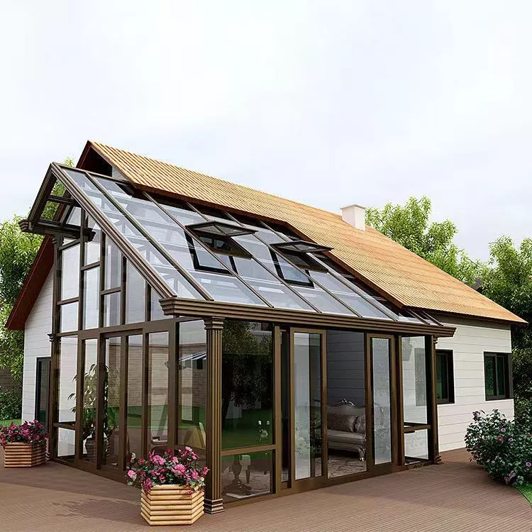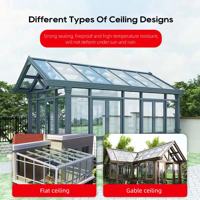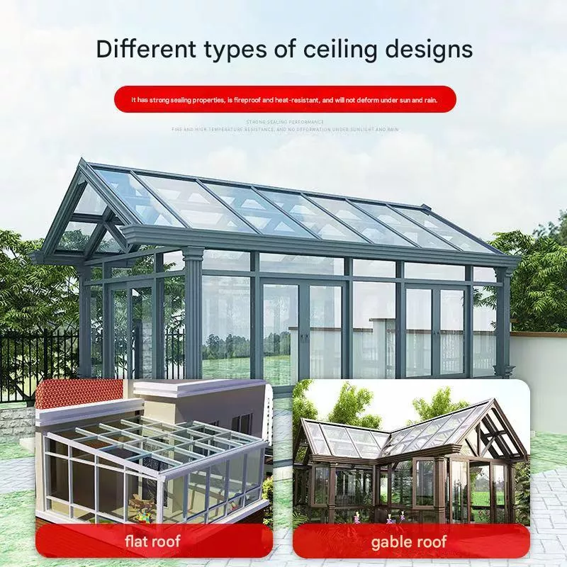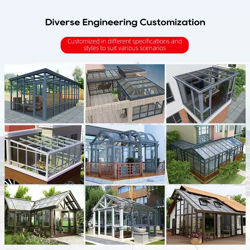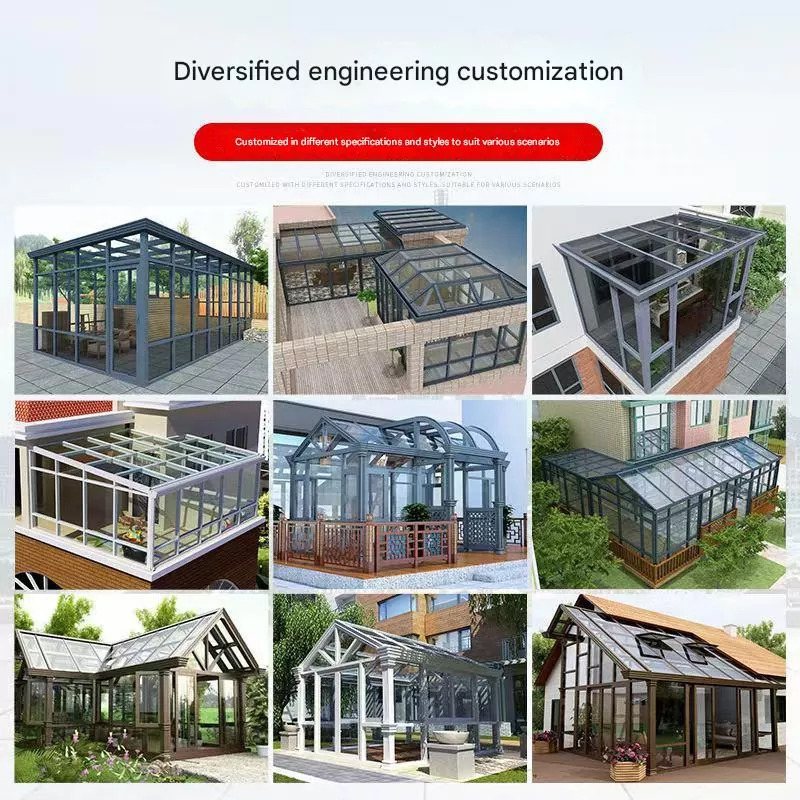 Güneşlenme odası benimser termal yalıtımlı alüminyum çerçeve + yalıtımlı temperli cam yapı. Çerçeve, modüler bir sistem aracılığıyla monte edilen kolonlar, kirişler ve çapraz desteklerden oluşur. dahil birden fazla çatı stilini destekler beşik çatılar, düz çatılar ve kavisli çatılar.